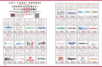 毎年人気のこの企画。今年も2号連載で皆様にリフトチケットをプレゼント!今月は全国61ゲレンデ、500名の方にドーンッと当たります!! 応募はFREERUN WEBサイトで受付中。FREERUN12月号のどこかに書いている「今月のキーワード」が必要なので、色んなページを読みながら探してみよう! |