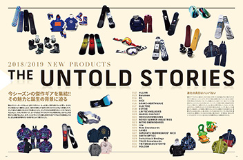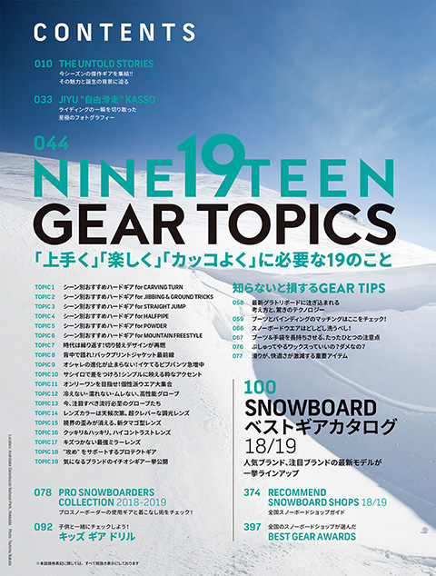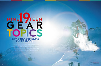 今シーズンのカタログ号の特集は、ギア選びに必要な19のトピックスです。まだまだ暑い夏が続きますが、希少なアイテムは早めに無くなってしまうこともあります。ぜひ手元において、ギアを吟味して、上手く・楽しく・カッコよく滑るためのギアを探してみてください。