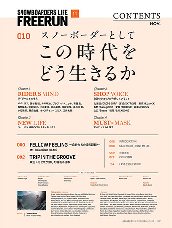 海外から日本に滑りにくるインバウンドの激減、逆に海外の雪山には行きづらい環境。その状況はどんな影響をもたらすのか?今まで経験したことがない新たなる冬を、様々な環境で生きるスノーボーダーたちはどのように見据えているだろうか? |