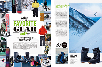 カタログ号の人気企画「MY FAVORITE GEAR」のプロライダー版です。ショップスタッフが “ギア選びの達人” なら、プロスノーボーダーは “滑りの達人” 。ギアやアイテムを誰よりも使い込んでいる彼らは、一体どういう目線で、どういう理由で、自らの使用ギアを選んでいるのかを探りました。総勢14人のプロライダーの声を聞いて、オンスノーでの使用感をイメージしてみてください。 |