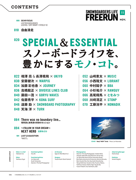 滑ることを主軸に置き人生の多くを過ごしてきたプロライダーやスノーボード業界人たち。彼らのスノーボードライフを形作ったもの、スタイルに滲み出るのは一体なんなのか。その秘密を探るべく15人のライダー&業界人にインタビューを敢行。スノーボードと共にある人生をより豊かにしたのは飽くなき追求だった。 |