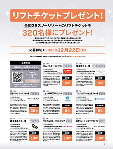 他にも、スノーボーダーのオススメのコースにスポットを当てた『BEST SNOW RESORT GUIDE』、320名様にリフト券が当たる『リフトチケットプレゼント企画』など、12月直前の人気企画も掲載! |